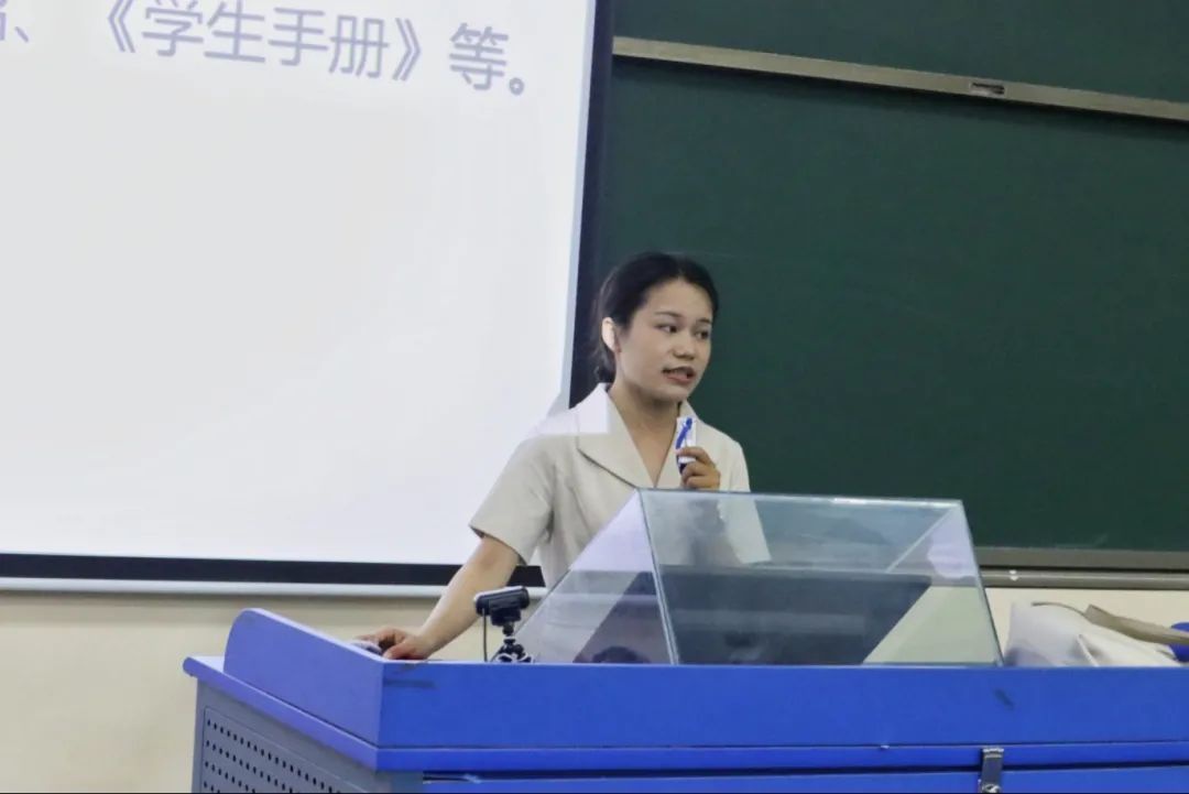 随后老师们借助形象化的PPT从学习、校园安全、请假流程、考勤制度和考试规定等多个方面详细地介绍了学校的规章制度。号召大家学会独立自主、相互尊重、精诚合作、承担责任,以便能充实快乐的度过大学时光。