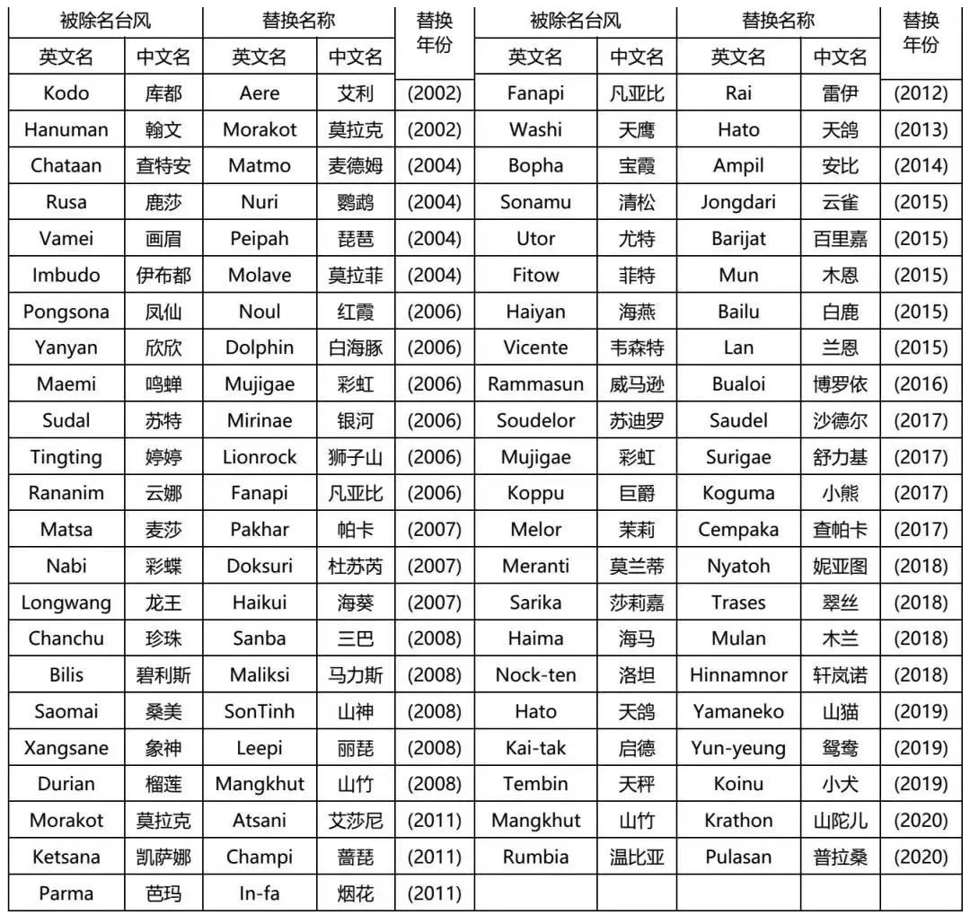 在2000年以后,台风的名字,是根据第31届台风委员会通过的西北太平洋和南海热带气旋(也就是台风)的命名表循环命名的(如下表)。这个命名表是由世界气象组织在亚太区域的14个成员国或者成员地区提供的。每个成员提供10个,所以共有140个名字,用来命名在西北太平洋和南海生成的台风。