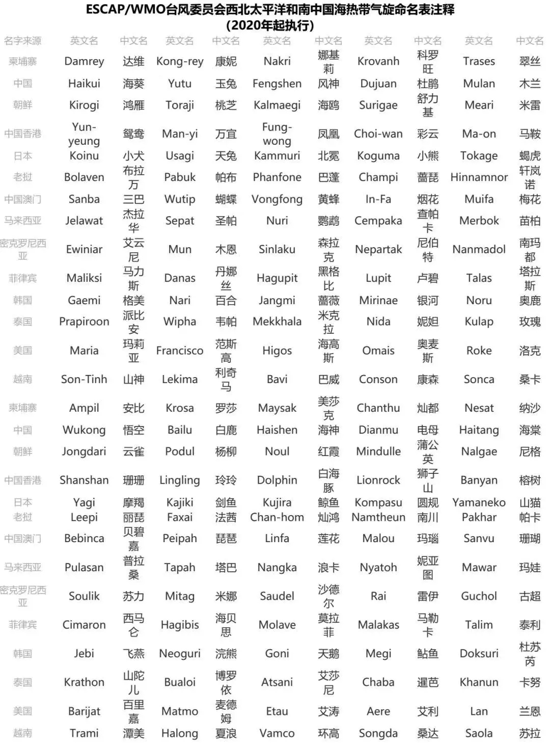 把这140个名字再分为10组,所以每组里面就有14个名字,每个成员各自提供一个名字,然后按照每个成员的字母顺序进行排序,然后循!环!使!用!不用担心台风的名字会被用完哦。而且这个名字会贯穿在热带气旋的整个生命过程。