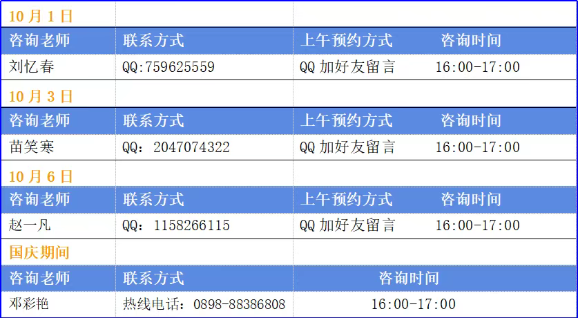 3.心理求助通道:若出现持续情绪低落、失眠、自伤倾向,联系学校心理咨询中心热线0898-88386808。假期期间(10月1日-10月8日)每周周一、周三和周五16:00-17:00提供个体心理咨询服务,具体安排见下表。
