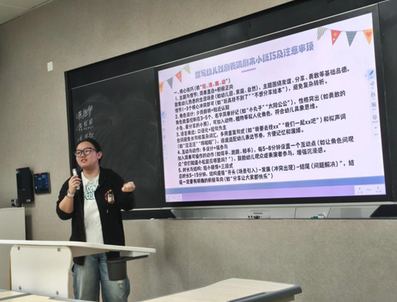 11月21日,罗芳老师的儿童戏剧表演研讨课迎来一堂特色实践课——校内“娃有戏”社团走进大一课堂,以“老带新”朋辈分享形式,向学弟学妹们倾囊传授戏剧表演实战经验,让课程实践维度实现深度拓展,为专业学习注入鲜活动力。