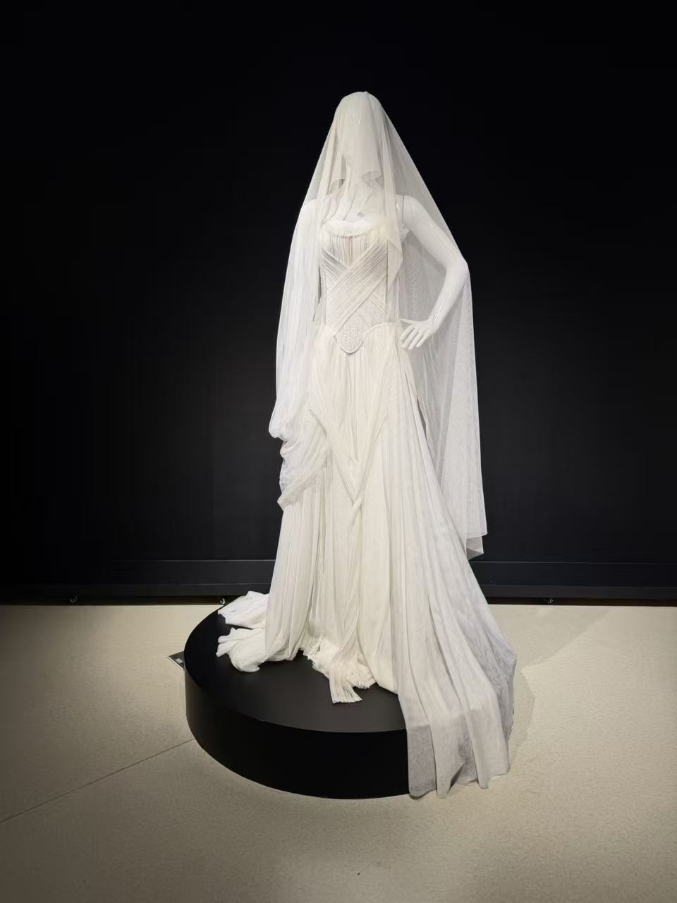 展区的黑色背景与上方射灯布展方式,使得婚纱极易过曝。2025级学生们表示连拍十张都“糊”。杨兰老师示意一位同学用手机手电筒侧打补光,并调整相机曝光度,解决了这一问题。同学们认为这种场景化教学带来的真实经验非常宝贵。