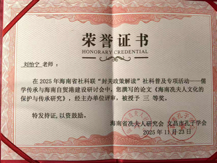 该论文因视角新颖、方法多元、建议切实可行,获得了与会专家的积极评价,并在最终评审中荣获“研讨会论文三等奖”。刘怡宁同学在会后表示:“能够将大创项目的研究成果带到这样高规格的学术平台进行交流,并得到专家们的认可,对我而言是极大的鼓励。未来我将继续深化对海南地方文化的研究,努力探索传统文化与当代社会发展相结合的更多可能。”