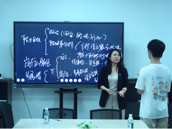 熊艳琴老师首先邀请同学们详细阐述各自的规划构想,并通过一系列专业提问,精准识别每位学生在自我分析、职业路径探索、目标可行性及行动方案等方面存在的个性化优势与不足。之后,她结合每位同学的专业特点、个人兴趣及目标行业,给予了具体且有针对性的调整建议。不论是规划书的逻辑梳理、专业能力与职业方向的结合,还是展示环节中个人经历的提炼与表达亮点的突出,熊艳琴老师均提供了细致入微的个性化指导。
