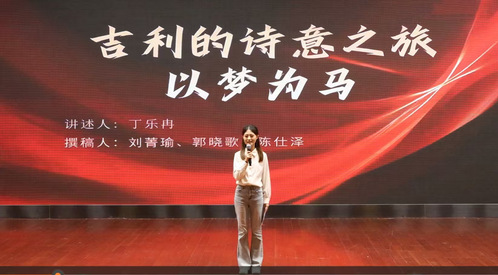 12位演讲者从不同维度讲述吉利故事,多元的叙事方式让同一企业故事焕发不同光彩。王岚、张育涵、张志慧三位选手采用情景式演讲,将李书福先生早期创业场景娓娓道来,让听众仿佛亲历那个“用榔头敲出第一辆车”的年代。晏靖雯则以古典诗词致敬企业家精神,刘茉菡通过“点亮三盏灯”的意象结构全文,这些创新形式让思政内容更加入脑入心。
