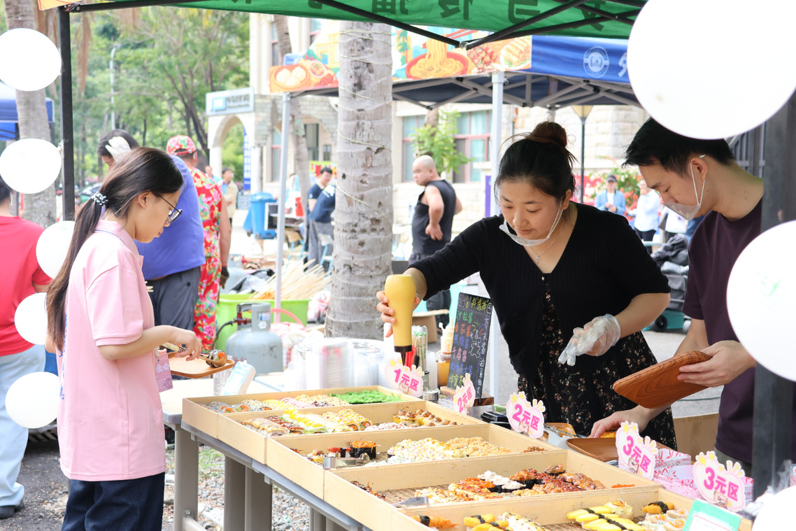 在美食与文化的交融盛宴中,人文与传播学院的展台亦以独特的方式,生动诠释着“美美与共”的节日主题。清爽沁润的水果茶、焦香诱人的烤鸡翅、创意满满的自选寿司,不仅展现出学院师生对美食的巧思,更成为连接味蕾与情感的温馨纽带。展台前人头攒动,师生们或驻足品尝,或笑语交流,在轻松愉悦的氛围中共享美味、传递温情。这份从味觉到心灵的温暖互动,正是校园和谐文化最生动的注脚,为人文之美增添了真挚而活泼的一笔。