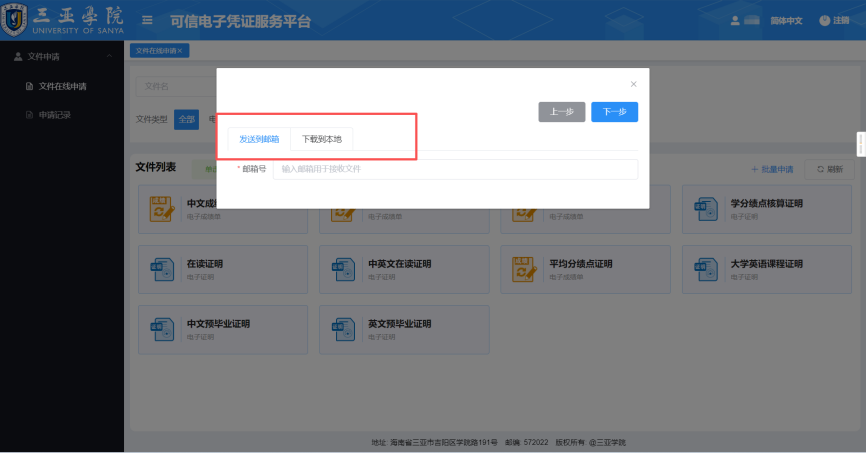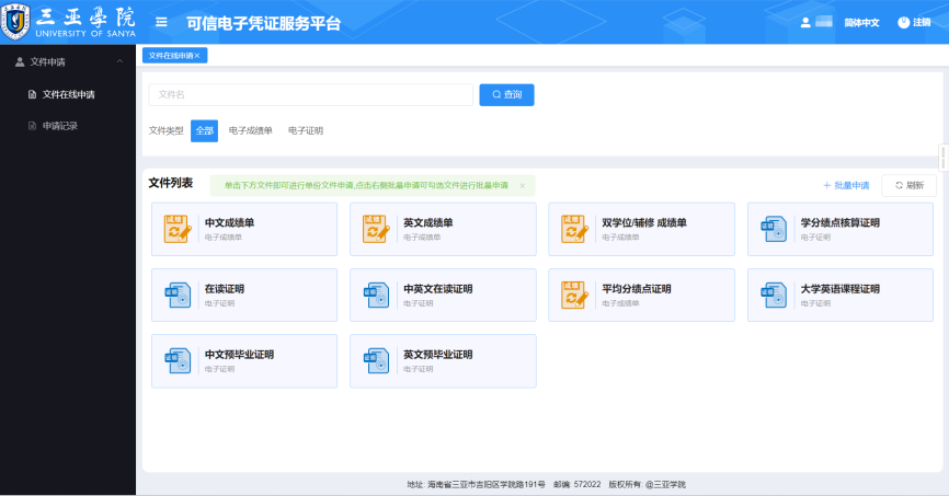 第一步:点击需要申请的文件,如“中文成绩单”;
