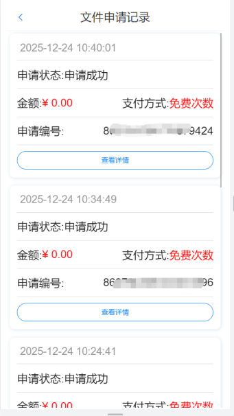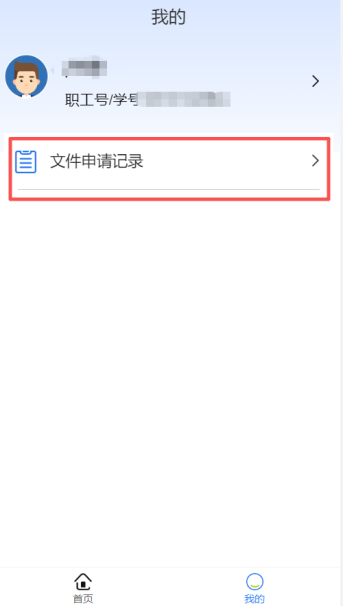 点击【我的】,进入个人信息界面,点击【文件申请记录】即可查看申请记录,点击【查看详情】可以再次下载此文件。