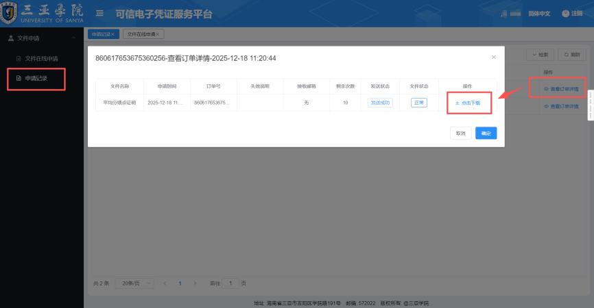 1. 点击左侧导航栏【文件下载记录】选项,可查询文件申请记录。