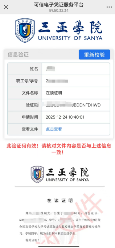 同学们可通过扫描文件中的二维码,对比扫码结果的文件内容是否和系统留存的原始文件是否一致。