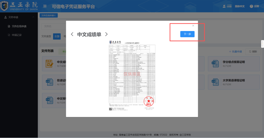 第一步:点击需要申请的文件,如“中文成绩单”;