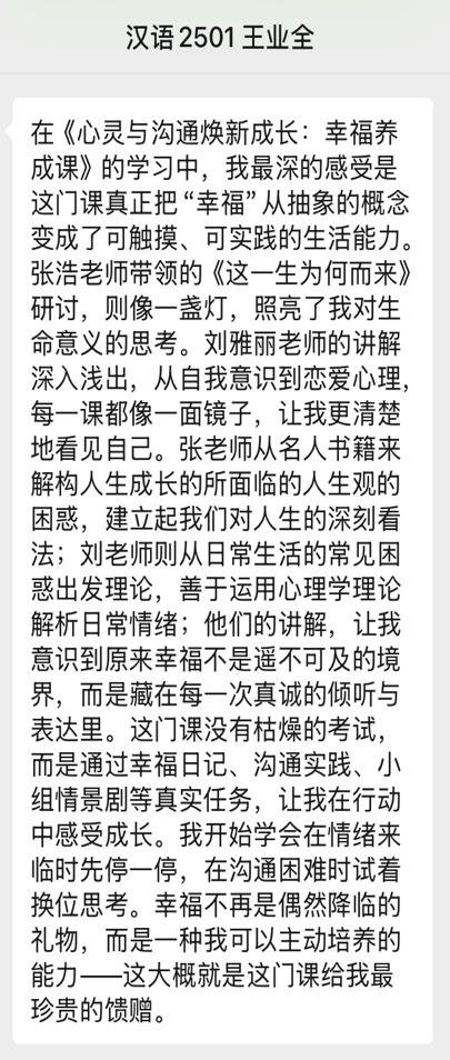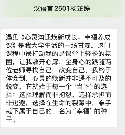 众多学生反馈,该课程打破了对“幸福课”的刻板认知,不仅带来知识滋养,还实现了心灵蜕变,让他们学会将抽象的幸福转化为具体的生活能力,是极具价值的成长必修课。