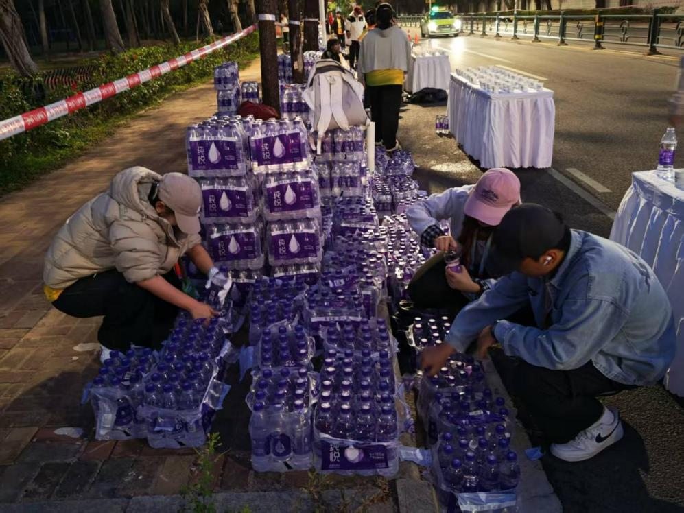 凌晨五点半,当城市仍在沉睡,人文与传播学院的志愿者们已在段维邦老师的统筹安排下抵达指定补给站,开启赛前筹备。分类摆放运动饮料、饮用水,整理能量胶、盐丸等物资,清理场地卫生,将水杯有序排列以便跑者便捷取用,每一个环节都细致入微。“跑者在赛道上全力冲刺,我们就要在补给站做到万无一失。”志愿者们牢记服务规范,用严谨筹备筑牢保障防线。