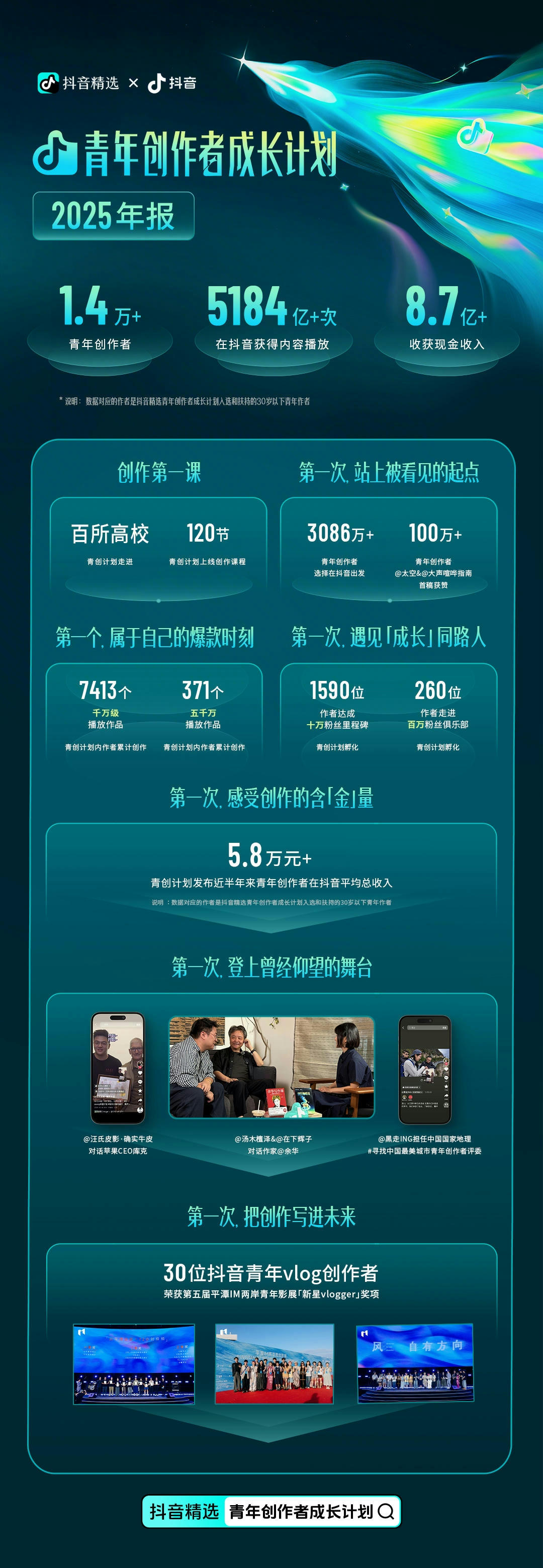 2026年,抖音精选青年创作者成长计划将投入更多资源、完善扶持体系,陪伴青年创作者成长的每一程。创作路上,抖音始终与大家同在。