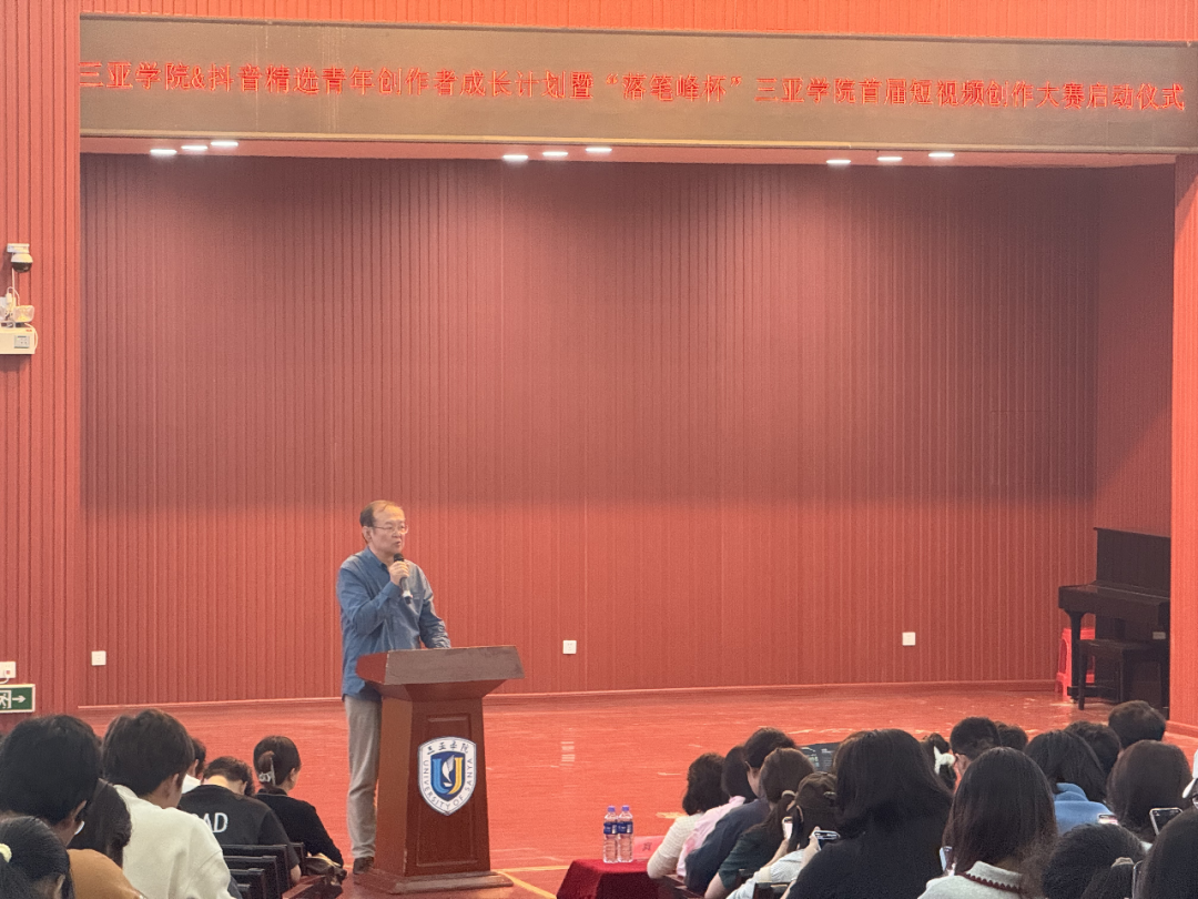 赖振寅院长在致辞中 首先感谢 抖音 “ 青年创作者成长计划的大力支持, 提出“人人皆是创作者”的 理念 。他 说 ,创作不仅是技术表达,更是一种带着温度的观看与反思 ,这次启动仪式 不只是一场比赛或活动,更是为所有怀有创作热忱的青年提供专业引导、朋辈激发与舞台照亮的机会。他鼓励学生从日常生活中提取“微光”,以短视频为媒介进行微叙事,共同构建真实多元的时代文化图景 , 创作有思想、能共鸣的“走心”内容,把属于三亚、属于青春的独特故事,变成自己的文化IP。