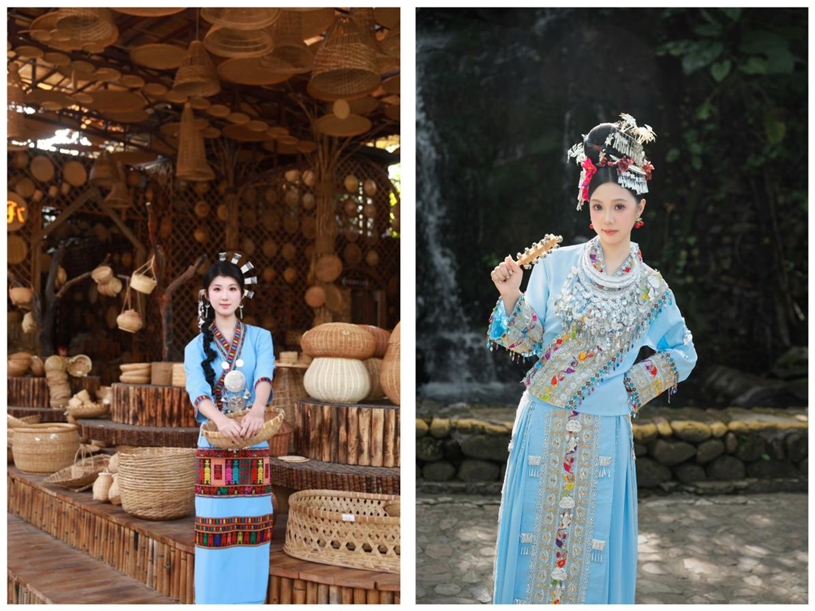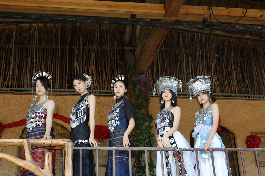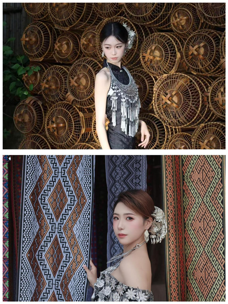 最具亮点的环节,莫过于学生们亲身穿戴黎苗传统服饰进行时尚演绎。身着靛蓝黎锦筒裙、缀满银饰的苗族盛装,学生们或漫步于竹林步道,或驻足于船型屋前,以镜头为媒介捕捉传统服饰的时尚美感。阳光穿过枝叶洒在银饰上,折射出璀璨光泽,行走间银饰碰撞发出清脆声响,与黎苗村寨的原生态景致构成一幅极具张力的画面。“传统苗银的厚重感与现代审美并非矛盾,通过搭配方式的调整,完全可以成为时尚点缀。”参与活动的学生陈美而表示,这种沉浸式体验让她对“民族元素的现代表达”有了更直观的理解,也为后续的时尚传播创作积累了鲜活素材。