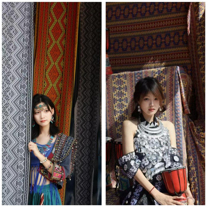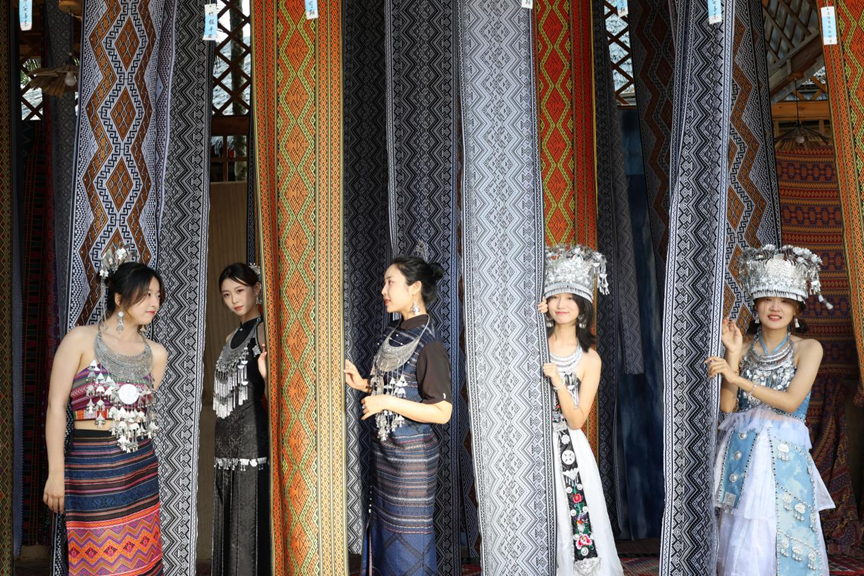 三亚槟榔谷作为海南规模最大、文化最完整的黎苗文化主题景区,完好保留了黎族船型屋、苗寨吊脚楼等传统建筑,更汇聚了黎锦、黎陶、苗族银饰锻造等国家级非遗技艺,成为此次文化探寻与时尚实践的天然课堂。活动伊始,学生们便被景区内浓郁的民族风情所吸引,在非遗传承人的指引下,近距离观摩了黎锦的精巧纺织过程与苗银的錾刻、拉丝技艺,了解到黎苗服饰上的蝴蝶纹、几何纹等图案背后承载的祖先崇拜与迁徙历史,深刻体会到传统工艺中蕴含的匠心与文化底蕴。