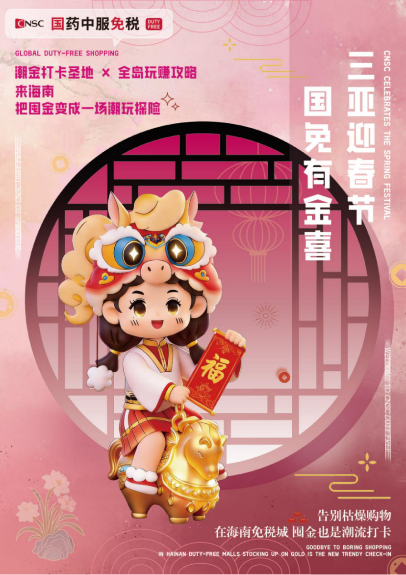 本次设计源于国药中服免税三亚店春节档期的宣传需求。在项目启动初期,肖雅玫同学在指导老师杨兰的悉心指导下,深入调研企业品牌调性与目标受众,最终确定了以IP形象创作”为核心的设计策略,同步产出平面海报与动态海报,全方位满足企业春节营销的传播需求。