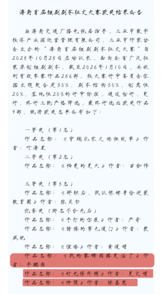 妙笔生花书短剧,佳篇获奖耀海南。3月10日,在刚刚落幕的海南首届短剧剧本征文大赛中,三亚学院人文与传播学院创意写作中心(暨三亚学院落笔文学社)的参赛同学们不负众望,取得了优异的成绩!3名参赛学子凭借扎实的文学功底与优秀的文笔,以兼具思想深度、艺术水准与时代温度的优秀作品在众多参赛选手中脱颖而出,斩获优秀奖3项。