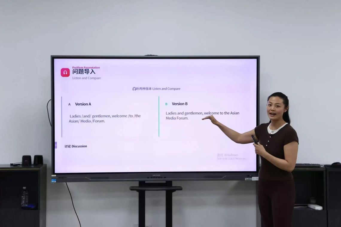 播音与主持艺术专业的王芊懿老师则以“英语连读技巧”为题,通过经典影视剧《老友记》片段,引导学生感受英语连读的流畅感,并强调流畅感不等于讲得快。她在讲解中术语运用专业准确,教学亮点频现。