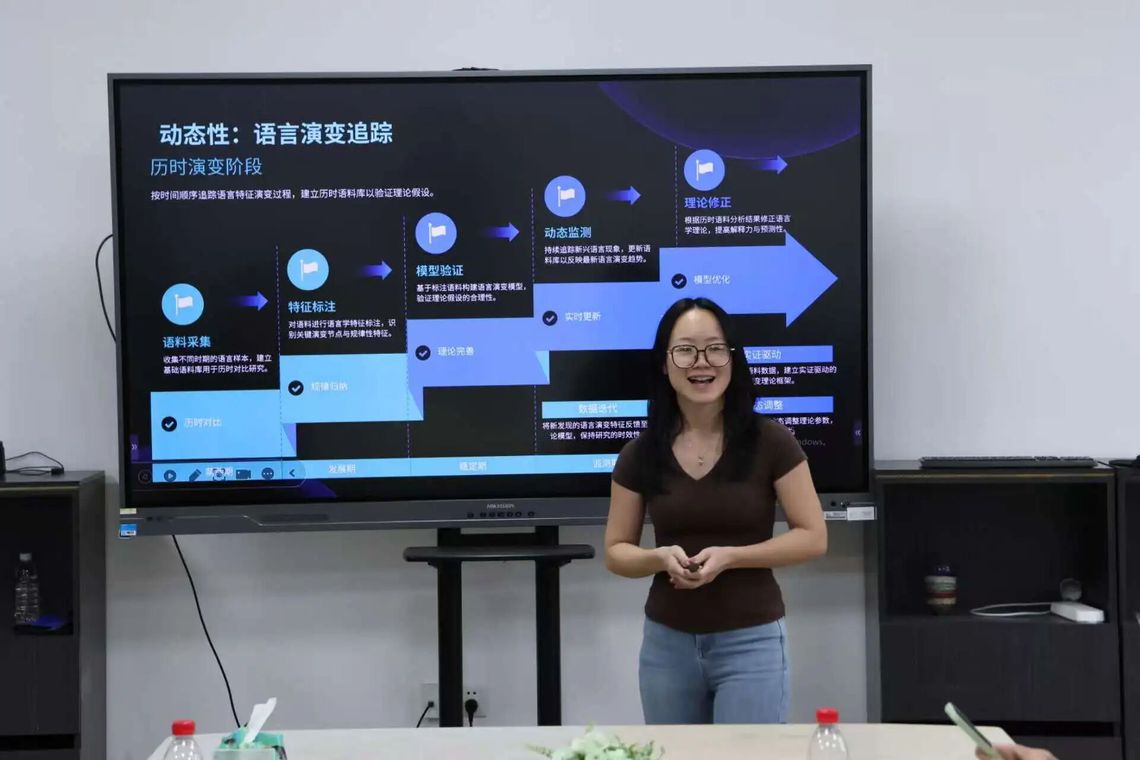 语言科技专业的邹悦老师聚焦前沿领域,以“平衡语料库的设计标准”为题进行分享。她结合现实案例,通俗易懂地阐述了语料库建设中样本动态性与均衡性两大特点,讲解深入浅出,引人入胜。